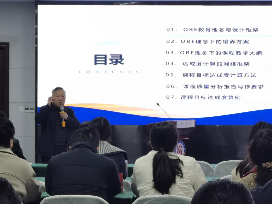 培训中,许道云院长围绕OBE(成果导向教育)的核心内涵、实施逻辑框架、课程目标与毕业要求的支撑关系、达成度计算方法及持续改进机制等方面进行了系统阐述。他指出,OBE理念强调以学生最终获得的能力为导向反向设计教学,实现从“教什么”向“为什么教”、从“教材中心”向“目标中心”的转变。通过构建“培养目标→毕业要求→指标体系→课程体系”层层支撑的链条,将模糊的教学效果转化为可量化、可追溯的评价数据,为教学质量的精准诊断与持续改进提供科学依据。