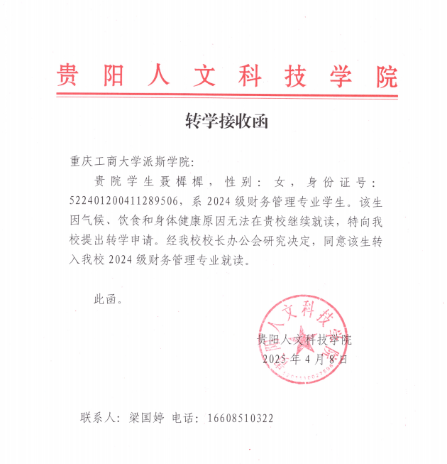 经学校研究决定,同意聂樨樨转入伟德官网学习。现予以公示