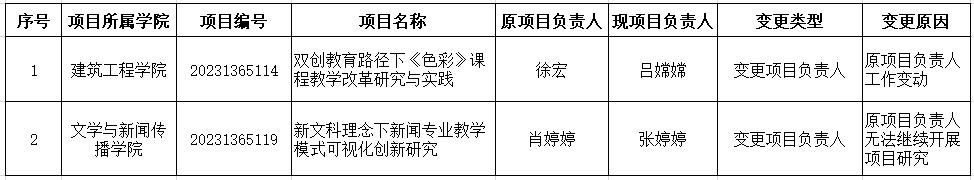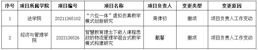为保障伟德官网教改项目持续有效进行,在2025年度教改项目结题工作开展过程中,经项目主持人主动申请、学院审核并报教务处备案,拟对部分项目的主持人进行调整,另有部分项目予以撤销,具体情况公示如下: