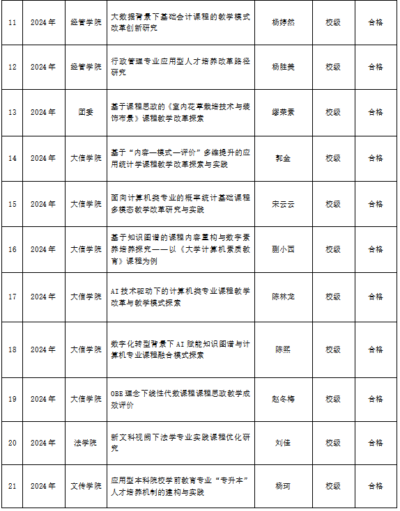 根据人文教字2025【91】《关于开展2025年度本科教学内容和课程体系改革项目中期检查的通知》要求,教务处组织专家对2024年立项的省级、校级教改项目进行中期检查。经专家审查材料、学校领导审定最终检查结果,现将本次中期检查结果进行公示,公示期为2025年11月25日至11月27日(共3个工作日)。如对检查结果有异议,请在公示期内向教务处反映。
