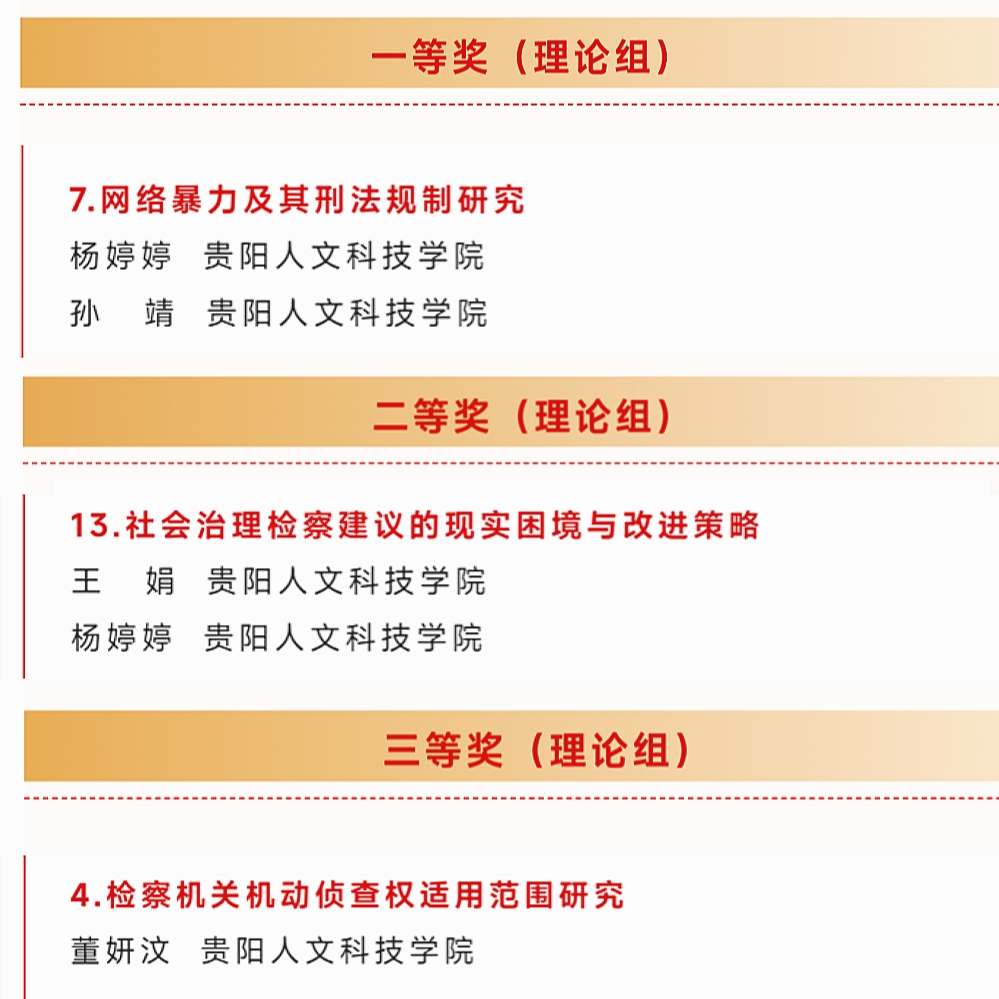 近日,北京市犯罪学研究会、贵州省法学会犯罪学研究会、贵州民族大学法学院、重庆邮电大学网络空间安全与信息法学院、威宁自治县人民检察院联合发布的第一届司法现代化主题征文获奖公告中,伟德官网杨婷婷、孙靖的参赛作品《网络暴力及其刑法规制研究》荣获(理论组)一等奖;王娟、杨婷婷的参赛作品《社会治理检查建议的现实困境与改进策略》荣获(理论组)二等奖;董妍汶的参赛作品《检查机关机动侦察权适用范围研究》荣获(理论组)三等奖。