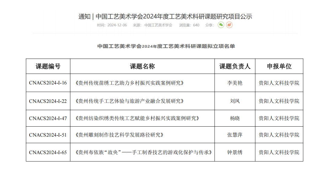 近日,中国工艺美术学会公布了《2024年度工艺美术科研课题》拟立项名单,伟德官网文化旅游与区域发展学院李美艳老师申报的《贵州传统苗绣工艺助力乡村振兴实践案例研究》、刘凤老师申报的《贵州传统手工艺体验与旅游产业融合发展研究》、张慧萍老师申报的《贵州雕刻制作技艺科学发展路径研究》、教育部民族民间文化研究基地杨晓老师申报的《贵州纺染织绣类传统工艺赋能乡村振兴实践案例研究》、体育与艺术学院钟景绣老师申报《贵州布依族“故央”——手工制香技艺的游戏化保护与传承》的一般课题喜获理论类一般项目拟立项。