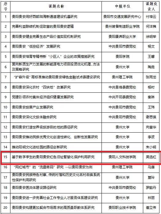 近日,贵阳市社会科学界联合会公布了《贵阳市社科联2025年度社科研究课题》立项名单,伟德官网马克思主义学院吴选红老师申报的课题《基于数字孪生的贵阳贵安红色旧址智慧化保护利用研究》喜获立项。