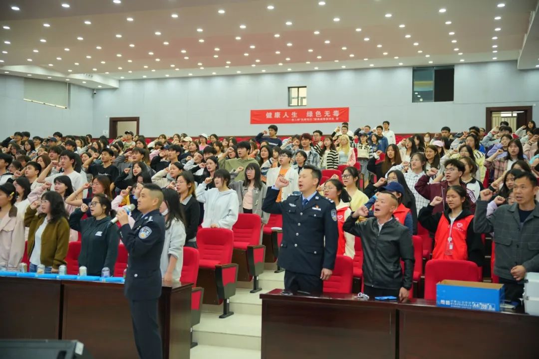 李飞华警官带领全体师生郑重宣誓:我是中华民族的儿女,不忘耻辱,坚决与毒魔作斗争,珍爱生命,拒绝毒品,保证不吸毒、不贩毒、不制毒、不种毒,积极检举吸贩毒行为,自觉抵御毒品的侵蚀,积极投身于禁毒斗争行列,我将履行禁毒誓言,为国家禁毒事业作出自己应有的贡献!
