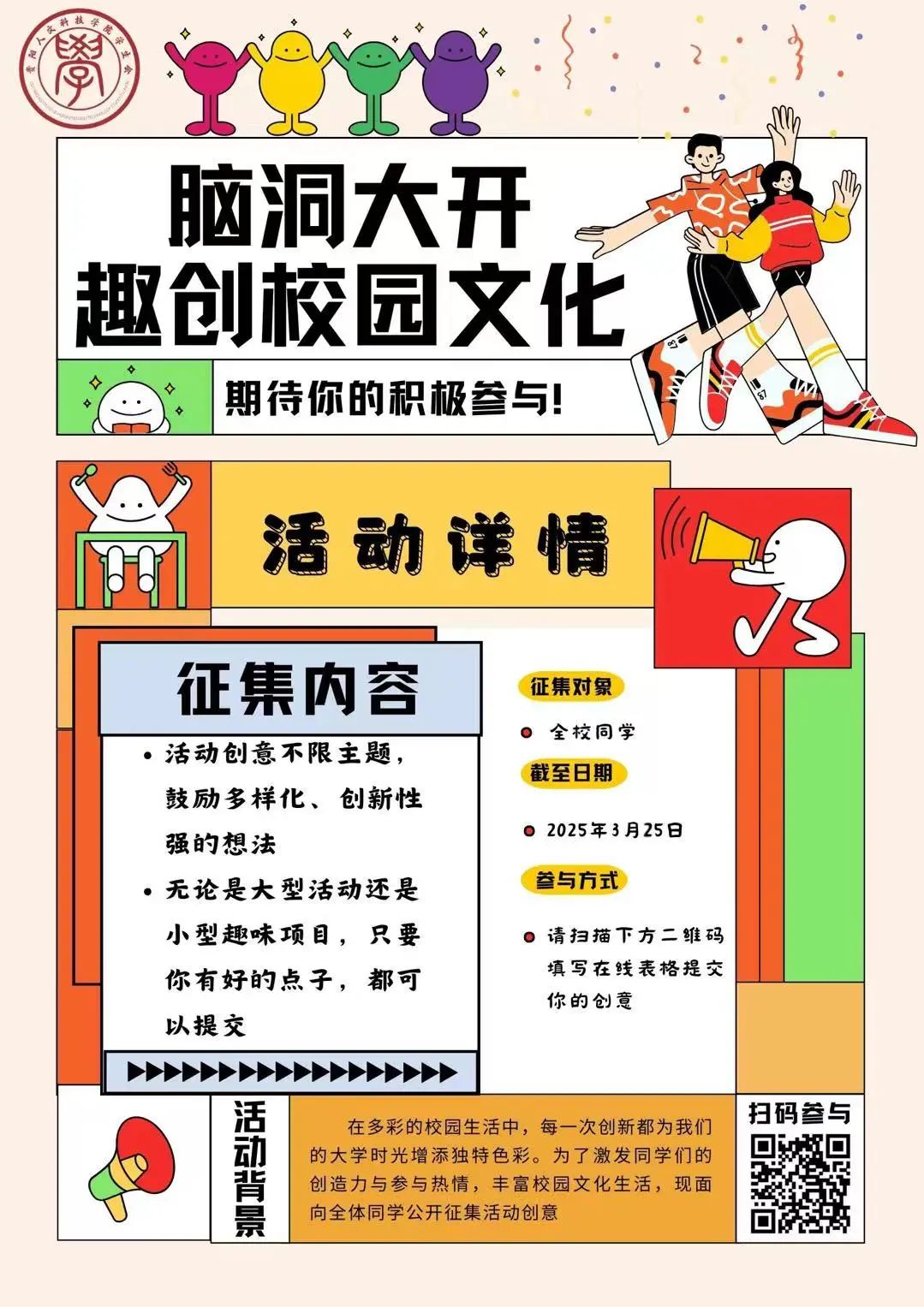 快来报名!让灵感点燃校园,让创意落地生根!期待你的奇思妙想,共同为校园生活注入新的活力!