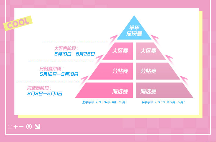 下半学年的赛事共分为海选赛、分站赛、大区赛、总决赛四个阶段。其中海选赛时间为 3 月 3日至5月11日;分站赛时间为5月12日至5月18日;大区赛时间为5月19日至5月25日;总决赛时间为5月26日至6月1日。同时,本届赛事为丰富玩家的赛事体验,将延续“耀”主理人共创搭子赛新玩法,角逐出“最强搭子”并颁发奖牌,让我们一起共同期待吧!