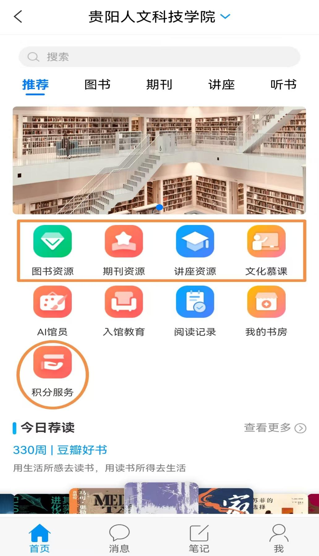 三、进入“阅读积分”界面,读者可通过学习“图书资源”“期刊资源”“讲座资源”“文化慕课”等板块的内容积累积分;可点击“积分服务”查看个人积分。