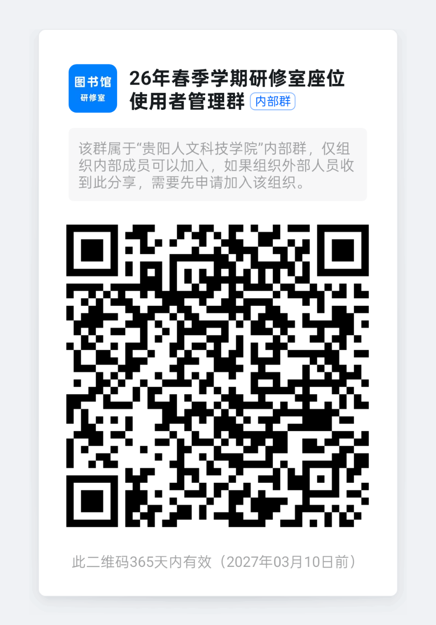 大学城校区图书馆研修室座位申请工作已结束,座位获得者名单已出,信息详见附件1-5。2026年春季学期申请使用研修室座位者名单以本通知附件名单信息为准。请获得座位的同学于2026年3月14日前扫钉钉二维码进群,3月11日至13日完成指纹打卡机的指纹录入。如在规定时间内未完成指纹打卡机录入指纹信息者视为自动弃权,空出来的座位继续分配给需要的同学使用。同时,关于研修室空位补录,请同学自行到校图书馆官网下载专区下载研修室补录申请表交至图书馆702读者服务办公室,空位补录名额有限,届时酌情分配。