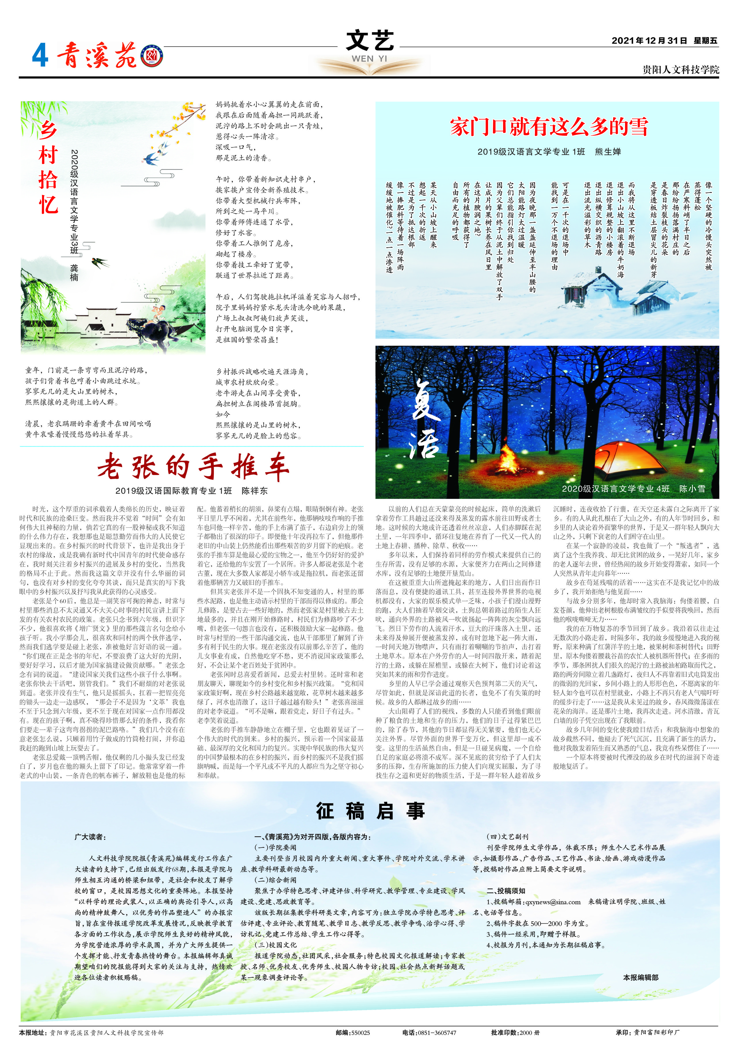 来稿请注明:学院、班级、姓名、电话等信息。稿件字数在500—4000字为宜,稿件一经采用,即赠予样报,校报为月刊,本报长期征稿。
