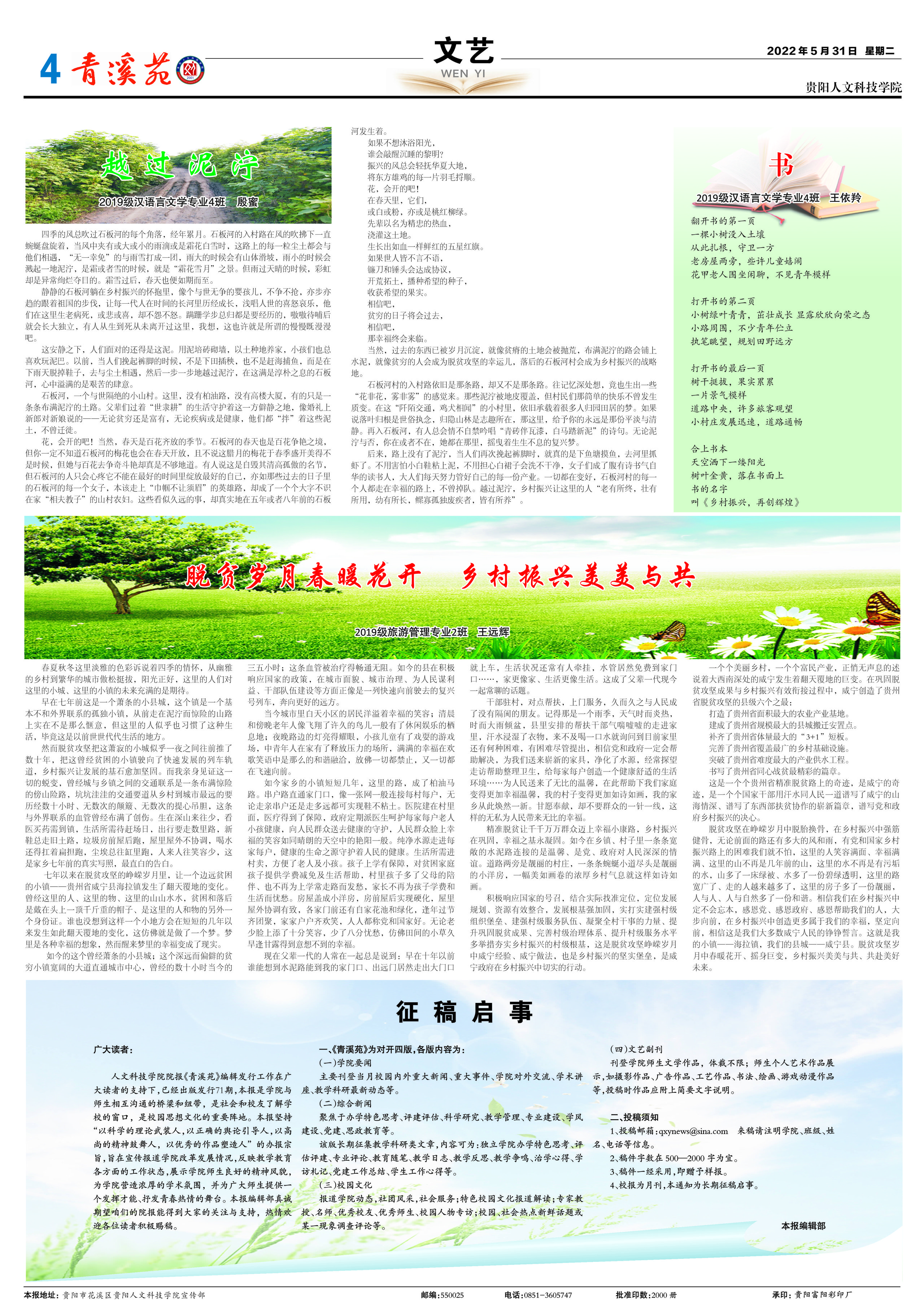来稿请注明:学院、班级、姓名、电话等信息。稿件字数在500—4000字为宜,稿件一经采用,即赠予样报,校报为月刊,本报长期征稿。