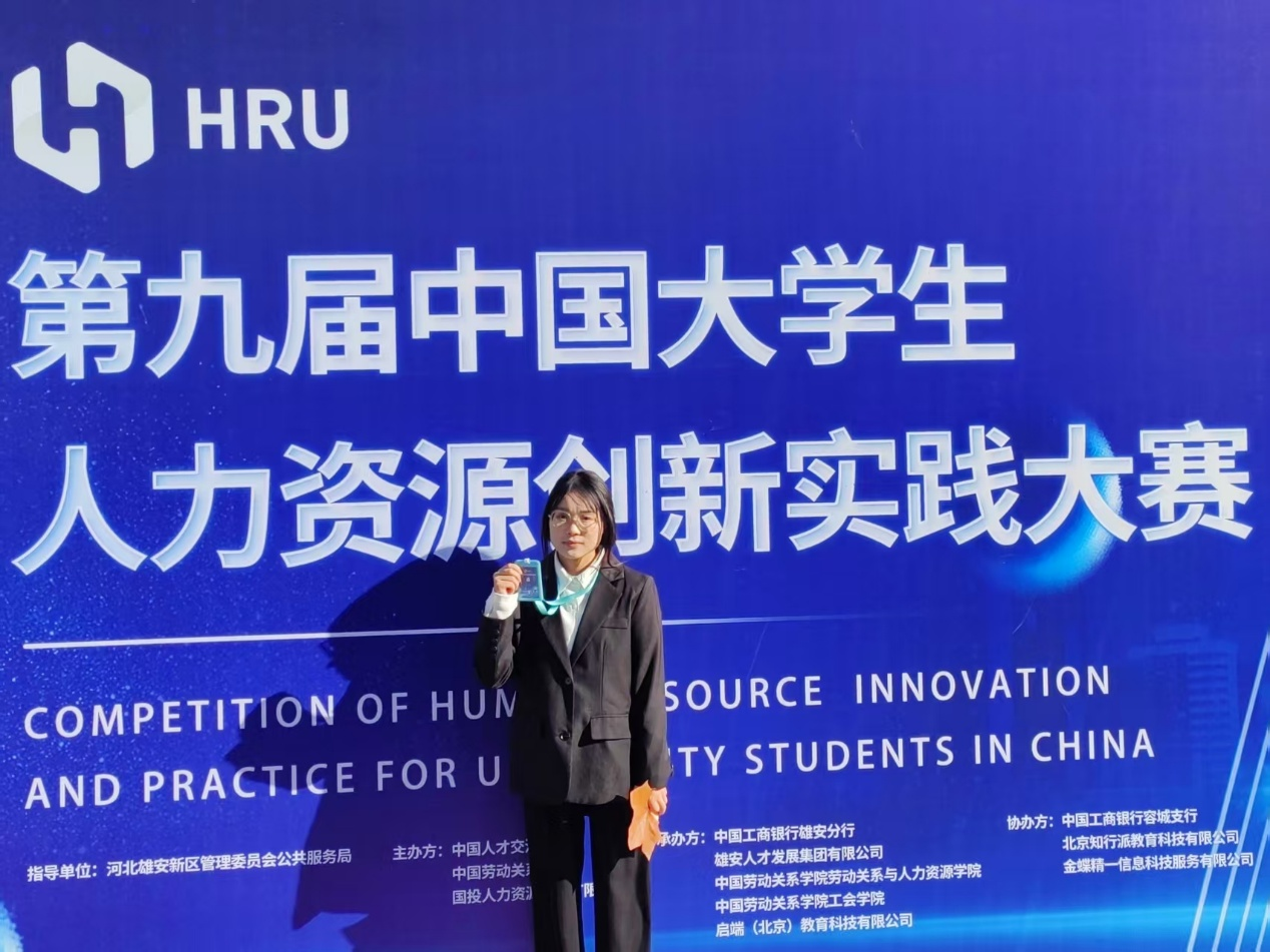 学科竞赛中,她坚持将理论转化为实践,从竞赛小白逐步成长,蜕变为勇于尝试、无惧失败的挑战者。2024年11月及10月,分别荣获第九届中国大学生人力资源创新实践大赛国赛个人“二等奖”及南方区域赛个人“特等奖”; 2023年12月,获伟德官网马克思主义学院“我心中的马克思主义”微剧展演“团体优秀奖”;2024年12月,获伟德官网经济与管理学院“勇惠杯”模拟求职大赛“二等奖”。