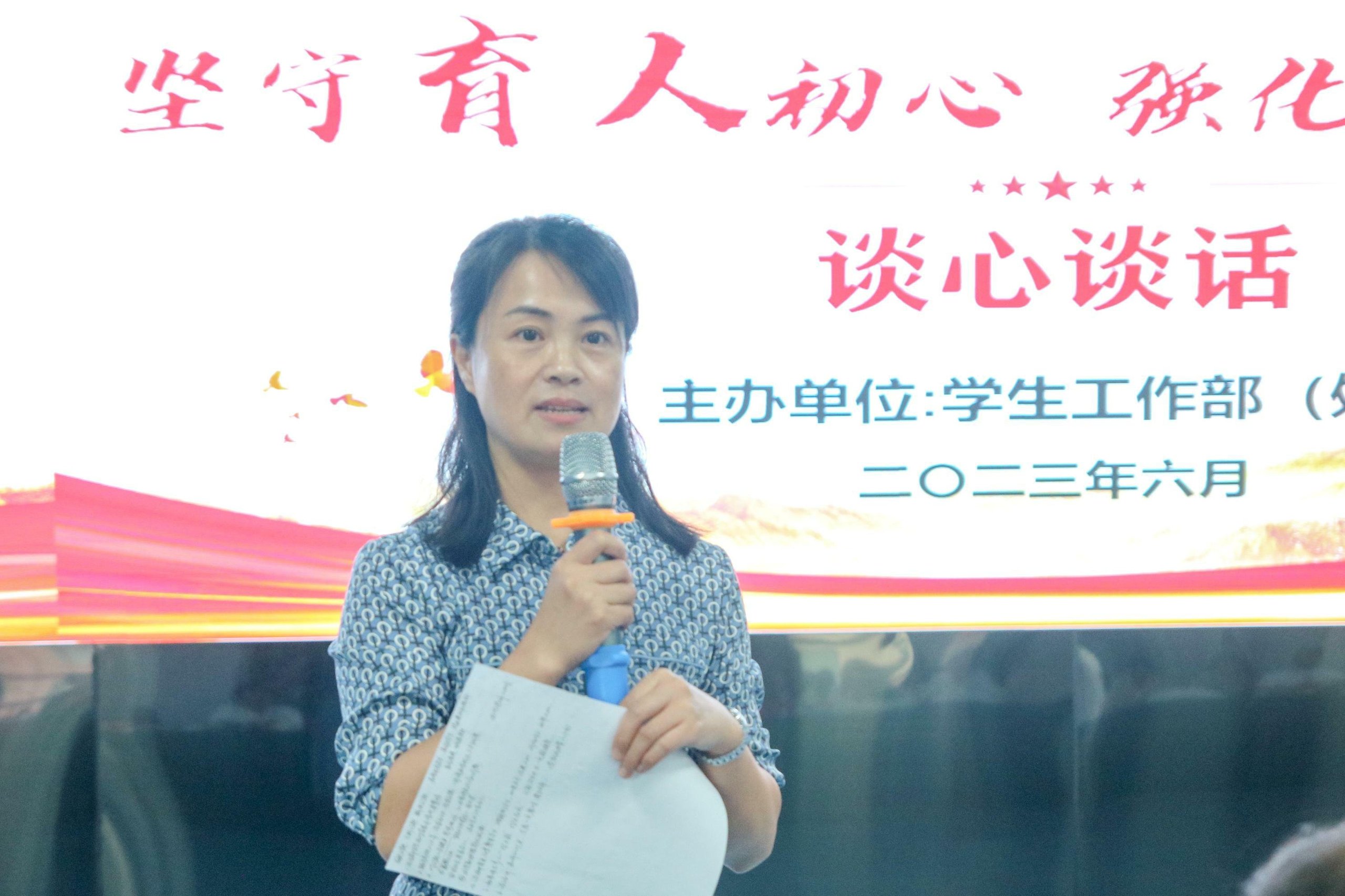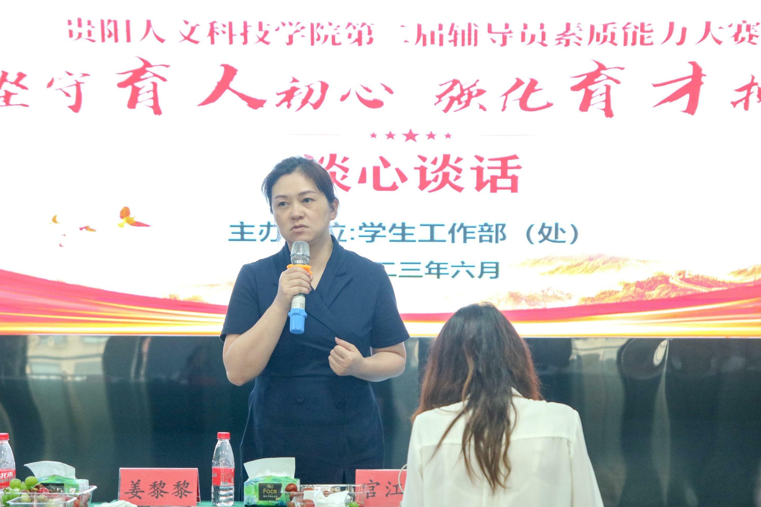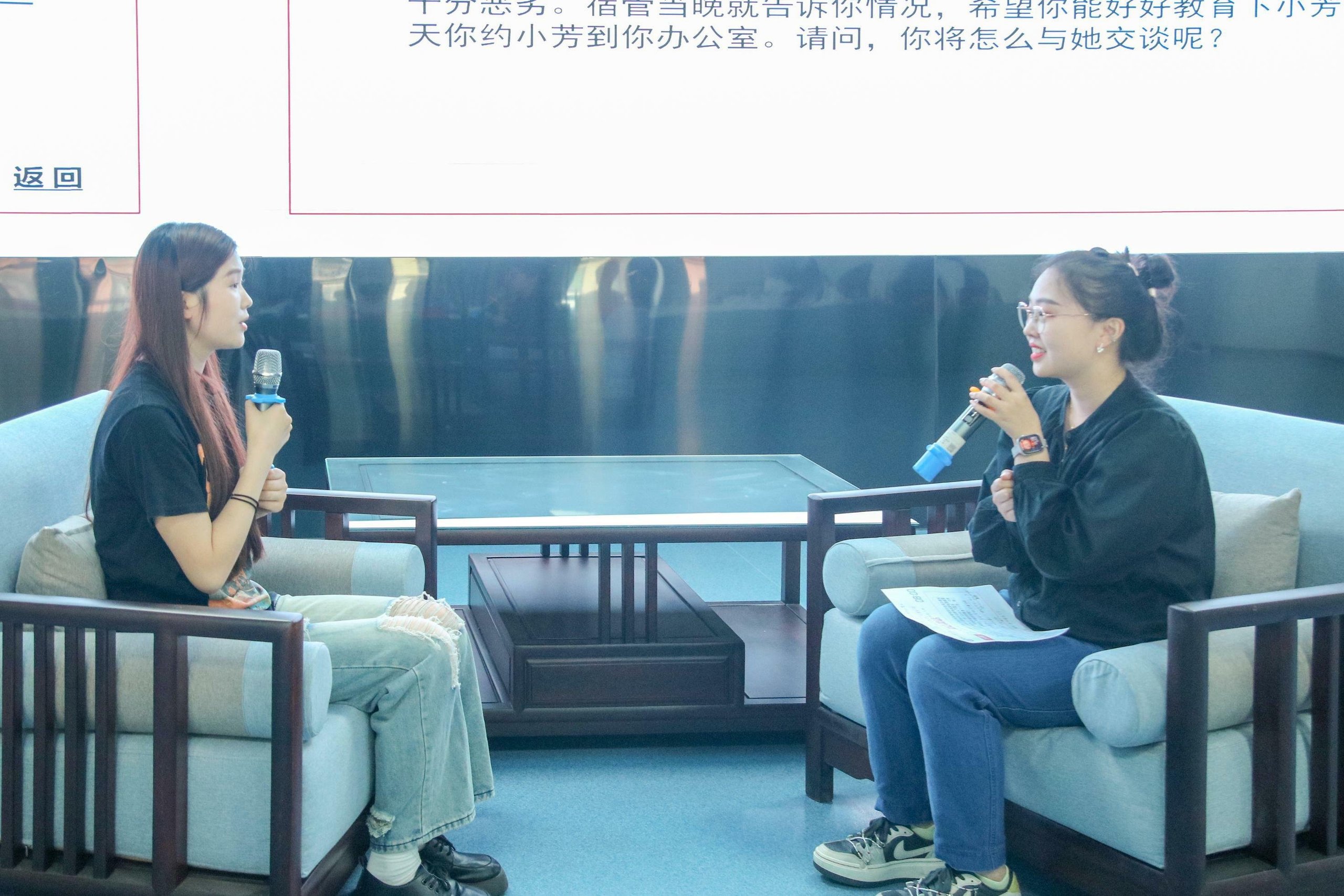 谈心谈话环节主要考察辅导员对学生特征、学生成长成才规律的了解把握程度,对学生的教育引导能力、解决理论困惑和实际问题的能力。参赛选手提前10分钟抽题,根据题目要求,以情景再现的方式与学生代表开展谈心谈话。谈话结束后,选手结合谈话情况进行简短总结,分析存在问题与改进措施。