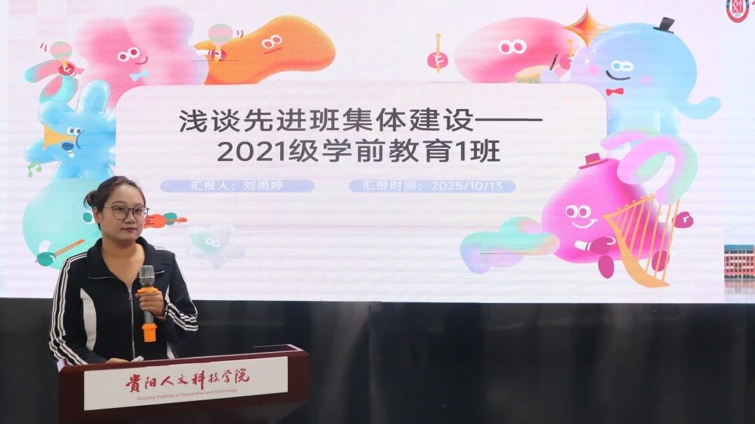 10月13日,文学与新闻传播学院刘雨婷老师分享了2021级学前教育1班获评省级先进班集体的经验。她生动讲述了通过树立价值观、建立激励机制、组建运动小组等方式打造良好的班风学风的过程,并强调“先进班集体不是‘管’出来的,而是师生共同‘创’出来的“。