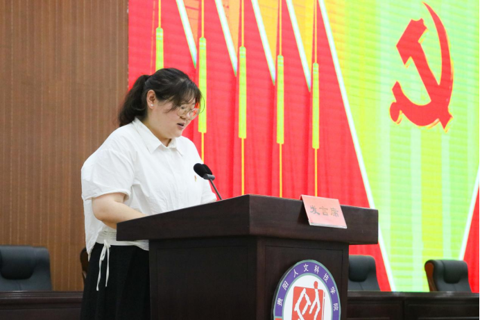 优秀共产党员代表2020级学前教育专业6班袁瑞桃同志发言说到作为一名新时代大学生党员,一要具有“泥犁拔舌自担当”的责任意识,只有奋斗才能成就更好的明天;二要培养“不破楼兰终不还”的拼搏精神,不惧困难,勇于向前。三要秉承“化作春泥更护花”的奉献情怀,在危难时刻义无反顾地冲锋在前,永葆共产党员的奉献精神。