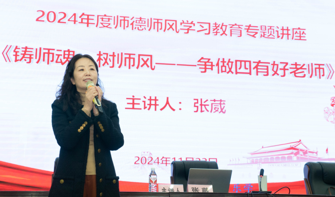 讲座上,张葳老师围绕“让教育成为一束光,照亮孩子的未来”进行全面介绍。通过案例分析,要求高校教师坚定政治方向、自觉爱国守法、传递正能量、潜心教书育人、关心爱护学生、为人师表、遵守学术规范和秉持公平诚信。