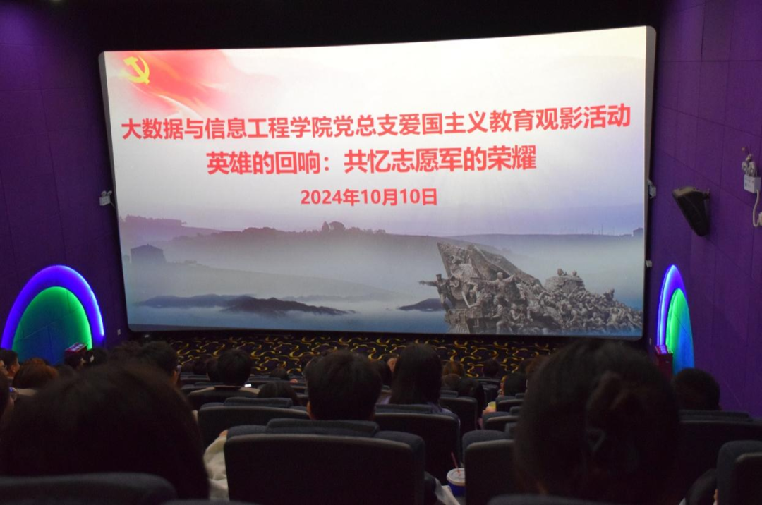 2024年10月10日,大数据与信息工程学院党总支开展爱国主义教育观影活动,组织学院师生共计120余人集体观看爱国主义题材影片《志愿军:存亡之战》。通过集体观影活动,进一步促进了各基层党组织之间的交流与学习,为在场的所有人“沉浸式”上了一堂生动的爱国主义教育课,激励大家在新时代、新征程中汲取奋进力量、赓续红色血脉、传承红色基因,为中国式现代化发展贡献出自己的青春力量