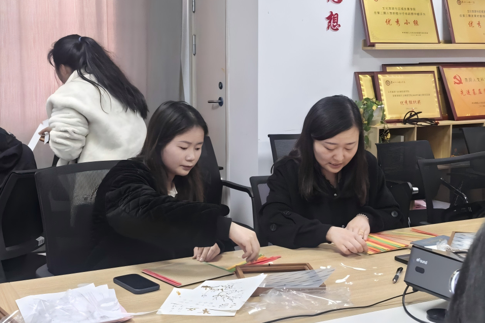 活动现场,非遗专职教师向大家介绍竹编的历史、技艺和用途,并示范一些简单的竹编技巧,如,“压一挑一”“挑二压二”等。通过一边操作一边讲解,大家逐渐掌握了竹编画的制作技巧,耐心编织出一幅幅精致的“二十四节气”手工竹编画。