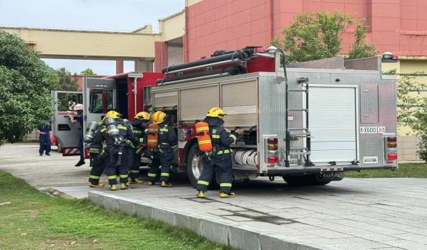 消防演练警报拉响,消防求援车开赴失火现场展开求援