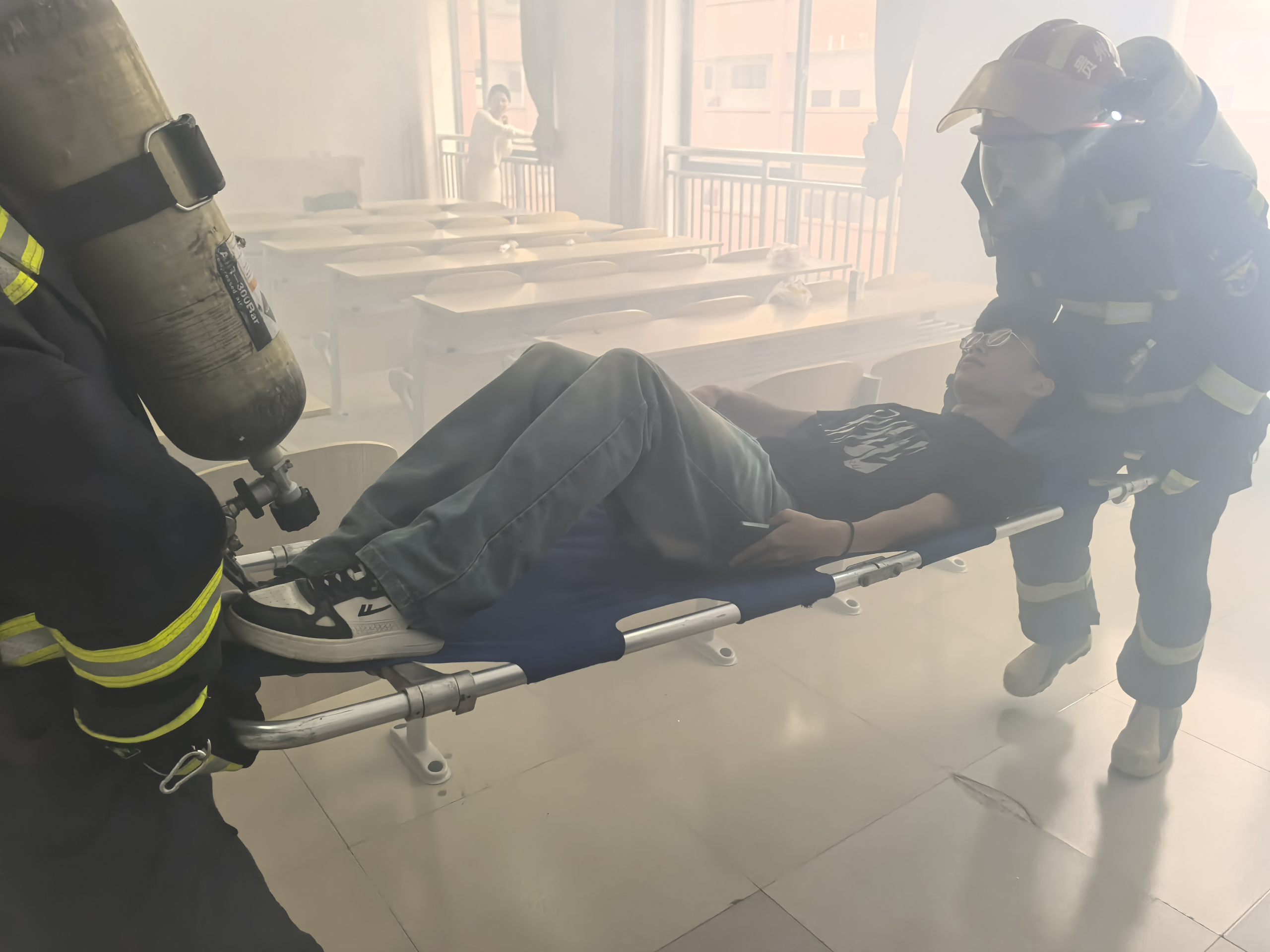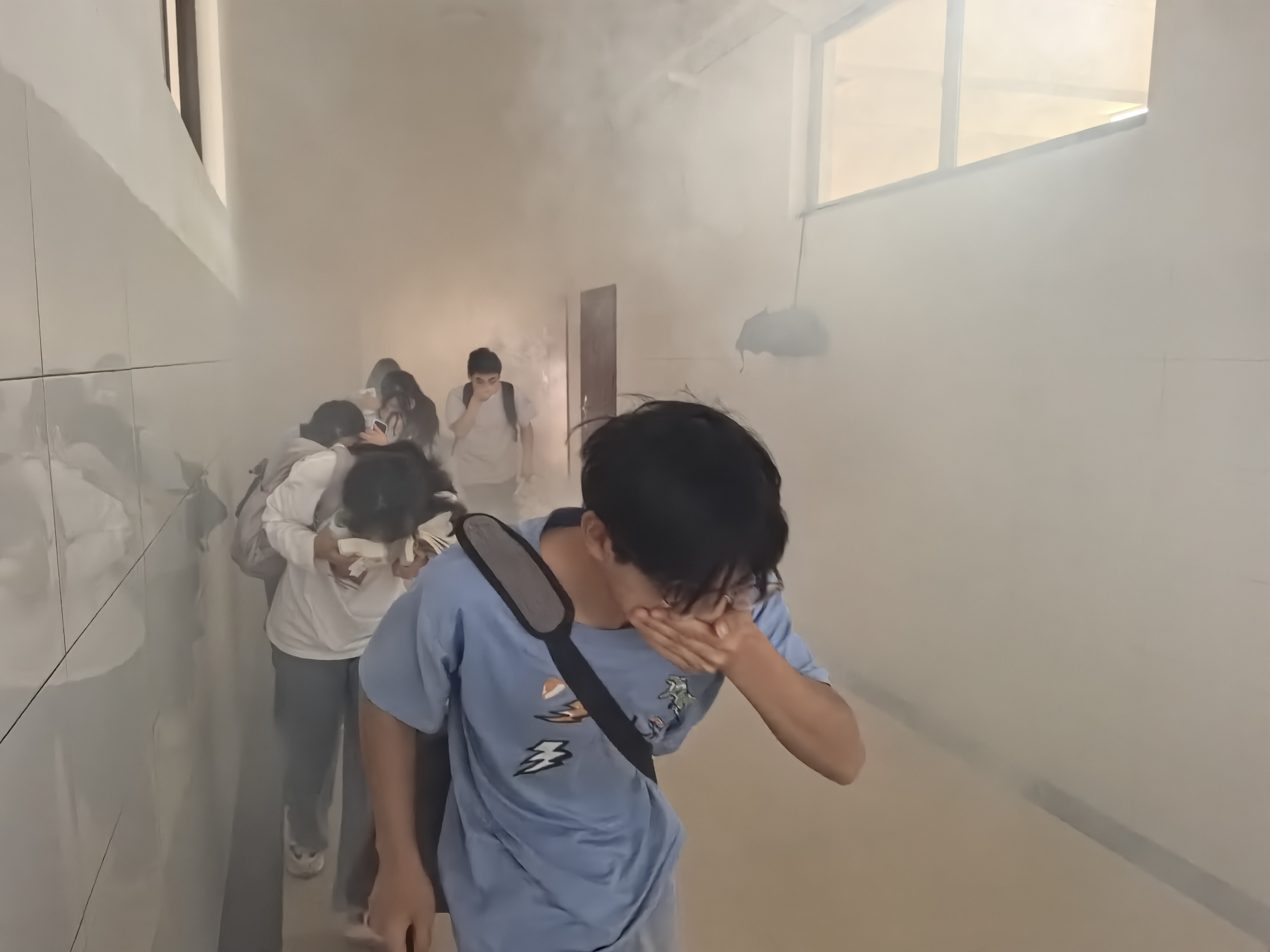随着警报声响起,消防演练正式开始。浓烟迅速在修身楼三楼走廊、楼梯拐角处弥漫开来,营造出了逼真的火灾氛围,消防支队消防员迅速到位,引导师生按照预定疏散路线迅速、有序地撤离到安全区域。