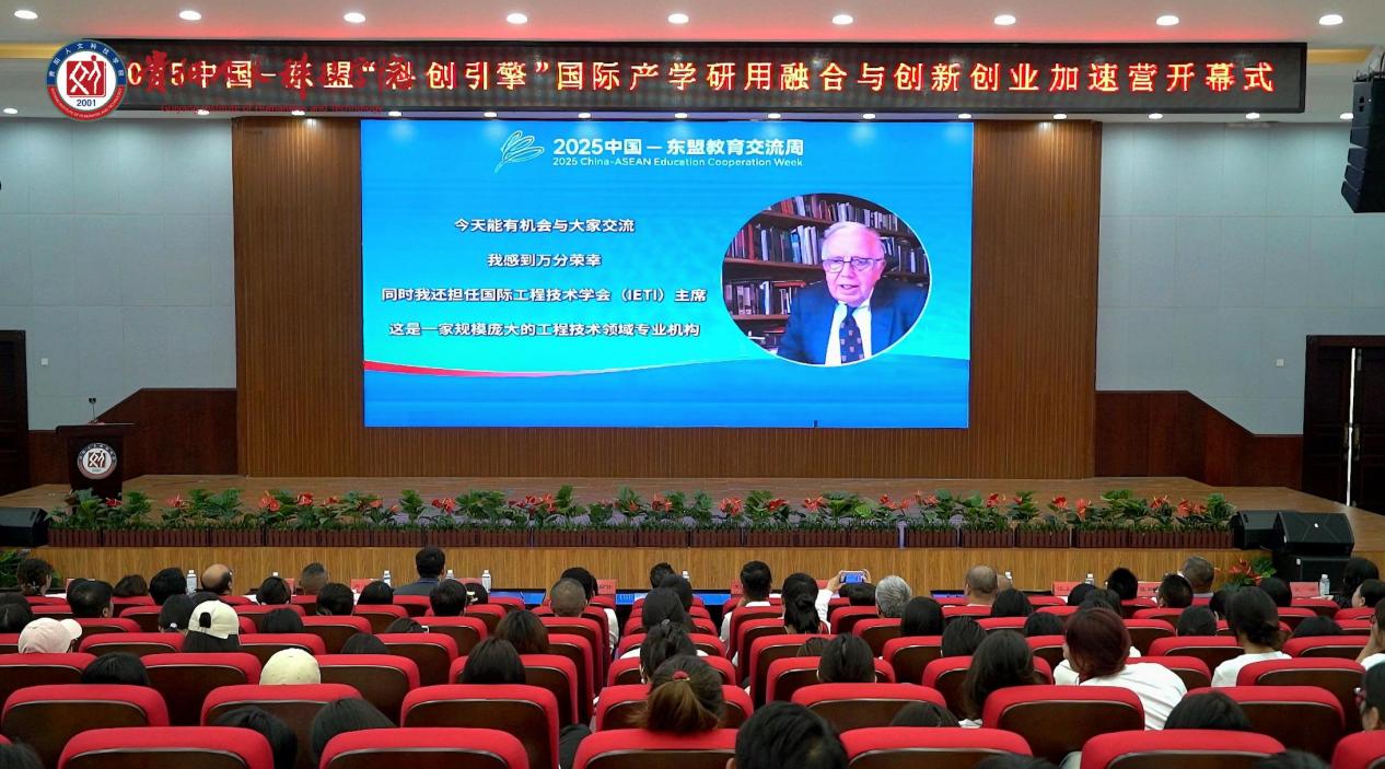 9月15日,在2025中国-东盟教育交流周系列活动——“科创引擎”国际产学研用融合与创新创业加速营开幕式英国牛津大学沃夫森学院院士、国际工程技术协会(IETI)主席James Crabbe应邀为伟德官网师生作线上专题讲座。James Crabbe院士围绕创新精神、跨国产业合作、前沿科研进展以及可持续发展等关键议题,与师生进行深入交流。