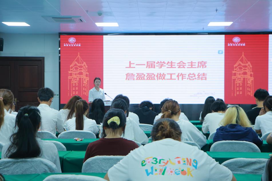 上一届学生会主席团成员詹盈盈围绕上一学年学生会工作进行详细汇报。她以日常管理规范化、活动组织品牌化、学生服务精细化为核心主线,系统总结学生会在服务同学成长、助力学院发展过程中取得的具体成效,全方位展现了上一届学生组织的责任担当与实干精神。