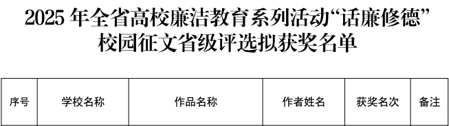 “话廉修德”校园征文类获奖3项:体育与艺术学院2024级动画1班刘德圣作品《笔尖绘清风,廉洁润初心》荣获二等奖;文化旅游与区域发展学院2024级农艺教育1班张平平作品《清是一把慢火》、法学院2022级法学1班周礼玉作品《清风拂校园,廉德润心田》荣获优秀奖。