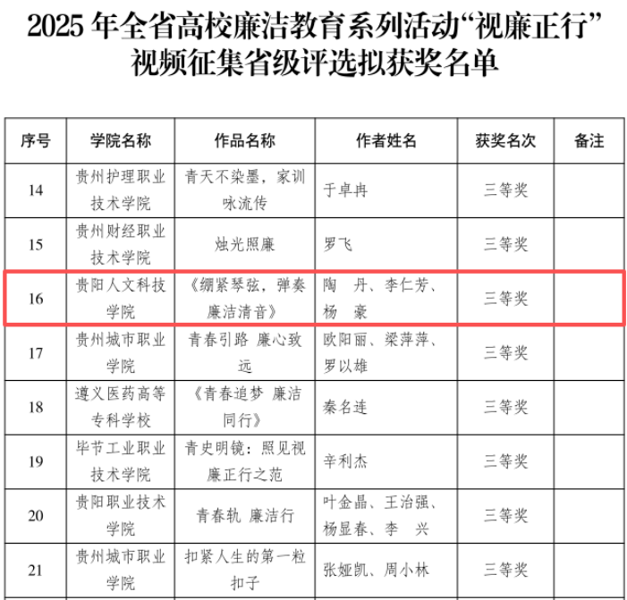 近日,贵州省教育厅公布 2025 年高校廉洁教育系列活动评审结果,伟德官网师生积极参与、精心筹备,凭借优质作品与扎实表现喜获佳绩,共斩获 4 项荣誉!充分展现了良好廉洁素养。