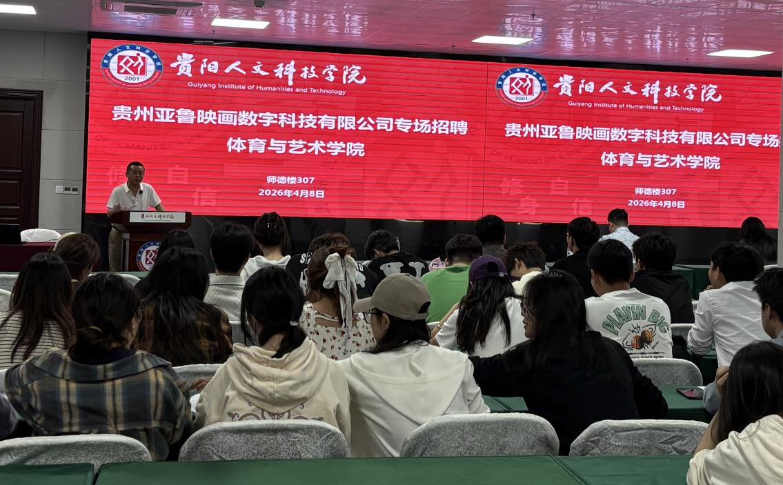 为扎实推进2026届毕业生就业工作,搭建校企人才精准对接桥梁,4月8日,体育与艺术学院在师德楼307成功举办贵州亚鲁映画数字科技有限公司专场招聘会。学院就业工作负责人唐兰芳老师主持本次活动,贵州亚鲁映画数字科技有限公司总经理周立志、人事经理张秋萌、商务运营总监邹海龙应邀出席,学院环境设计、动画、美术学、视觉传达设计等专业110余名学生到场参与。